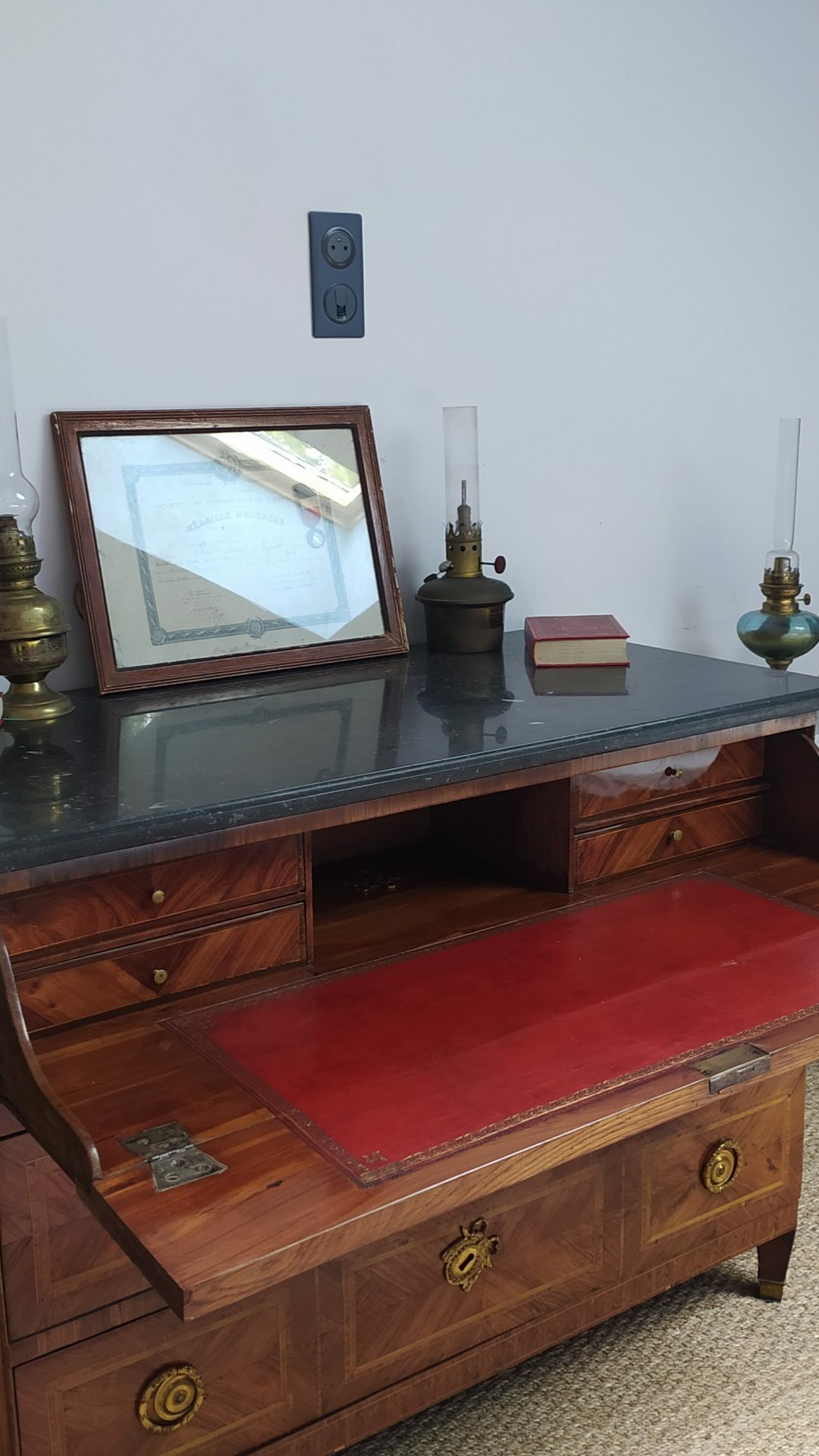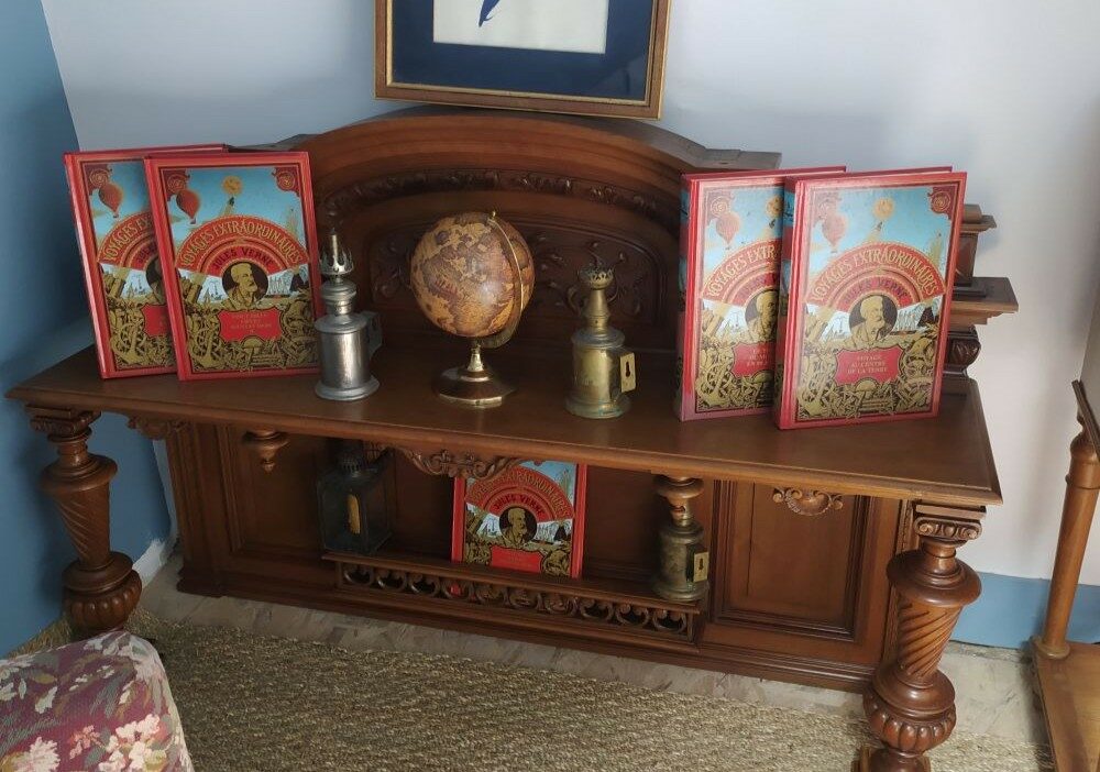 Dans les dernières années du Second Empire, Jules Vernes était encore à peine connu… Cependant, nous savons que l’impératrice Eugénie a fait l’achat de cinq ouvrages entre 1865 et 1869. Vous trouverez des romans dans la chambre également. Le Nautilus est un sous-marin, un engin de fiction du roman Vingt Mille Lieues sous les mers imaginé par Jules Verne. Lors de la parution du roman, les sous-marins existaient déjà, cependant les équipements et le fonctionnement général du Nautilus le montrent comme un vaisseau en avance sur tous les systèmes de navires existants à cette époque.